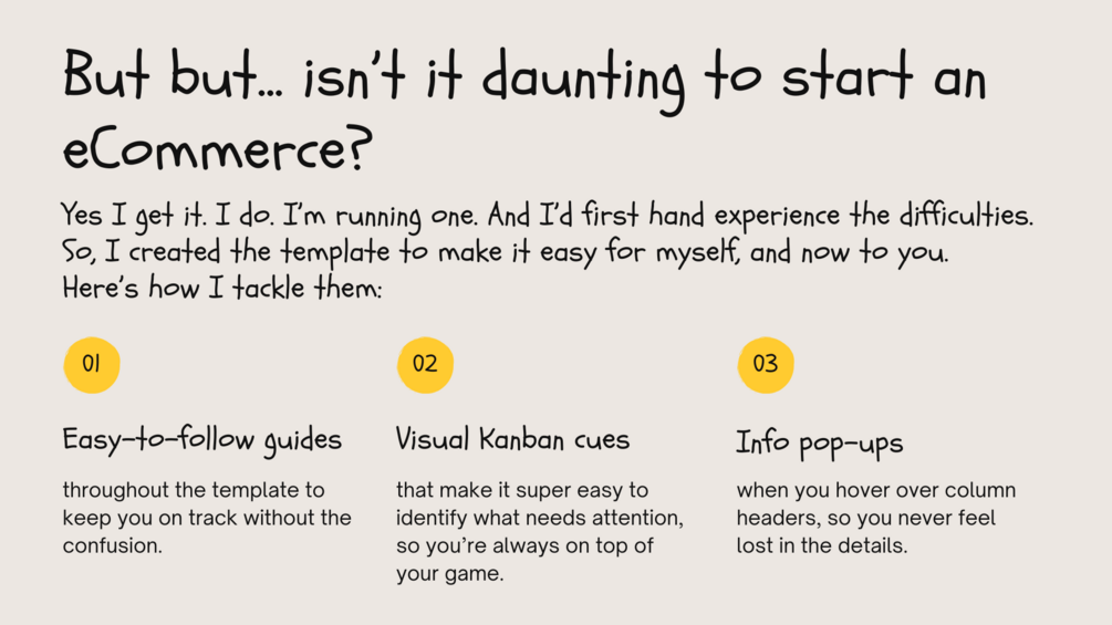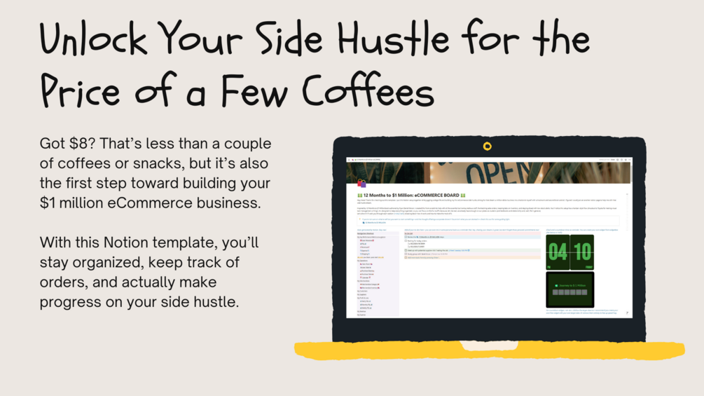 Got $8? Thatâs less than a couple of coffees or snacks, but itâs also the first step toward building your $1 million eCommerce business. With this Notion template, youâll stay organized, keep track of orders, and actually make progress on your side hustle.