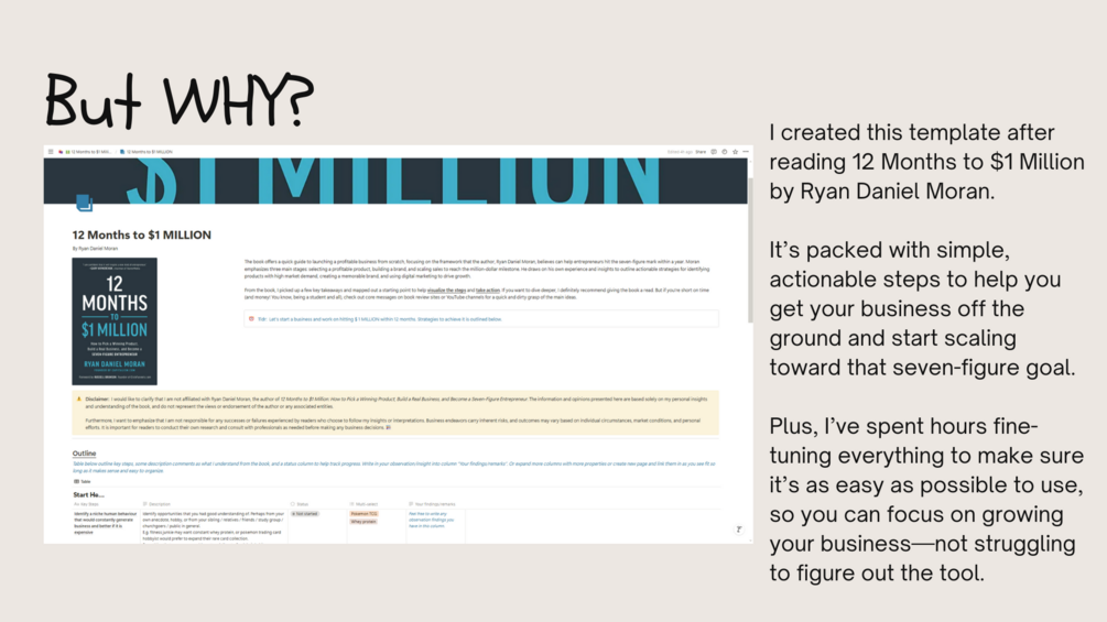 Now, where were we? Ah yesâsome quick backstory on this template. I created this template after reading 12 Months to $1 Million by Ryan Daniel Moran. Itâs packed with simple, actionable steps to help you get your business off the ground and start scaling toward that seven-figure goal. Plus, Iâve spent hours fine-tuning everything to make sure itâs as easy as possible to use (which means that you don't have to), so you can focus on growing your businessânot struggling to figure out the tool.